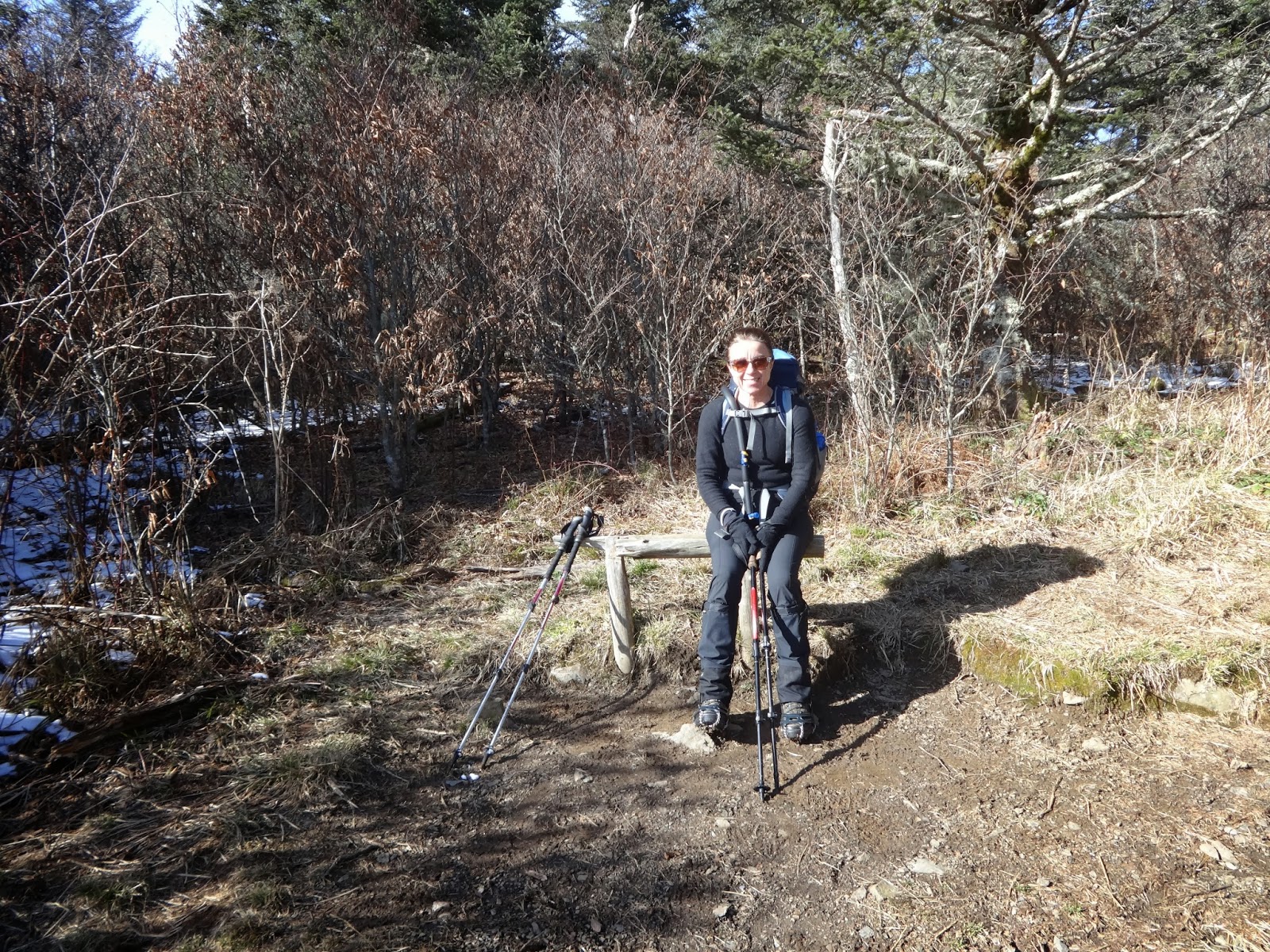 We're so far ahead of schedule that we take a short excursion on a side trail with an old bench and nice view, right in the sun. It's so warm here that the snow has almost all melted and the ground is muddy instead of icy.